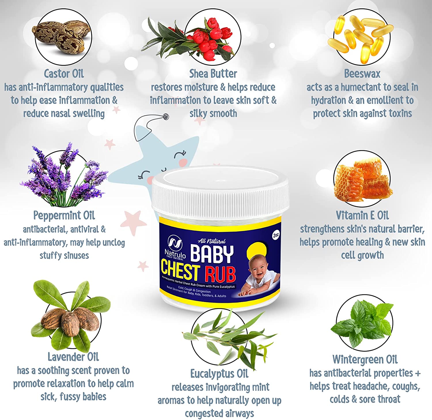 Sniffles & stuffy noses are calmed by the soothing properties of our all natural chest rub for baby. An infusion of pure oils & extracts, this organic chest rub is the natural choice baby chest rub for congestion relief. The chest rub ointment can be used as a chest rub for kids, babies or toddlers.